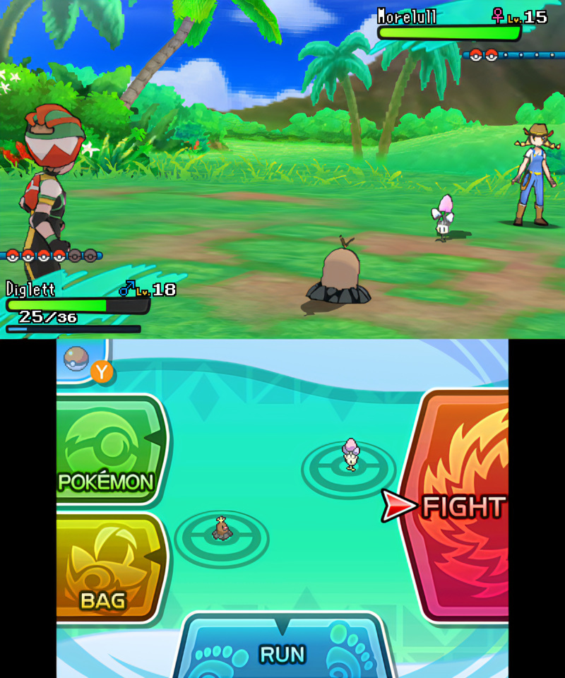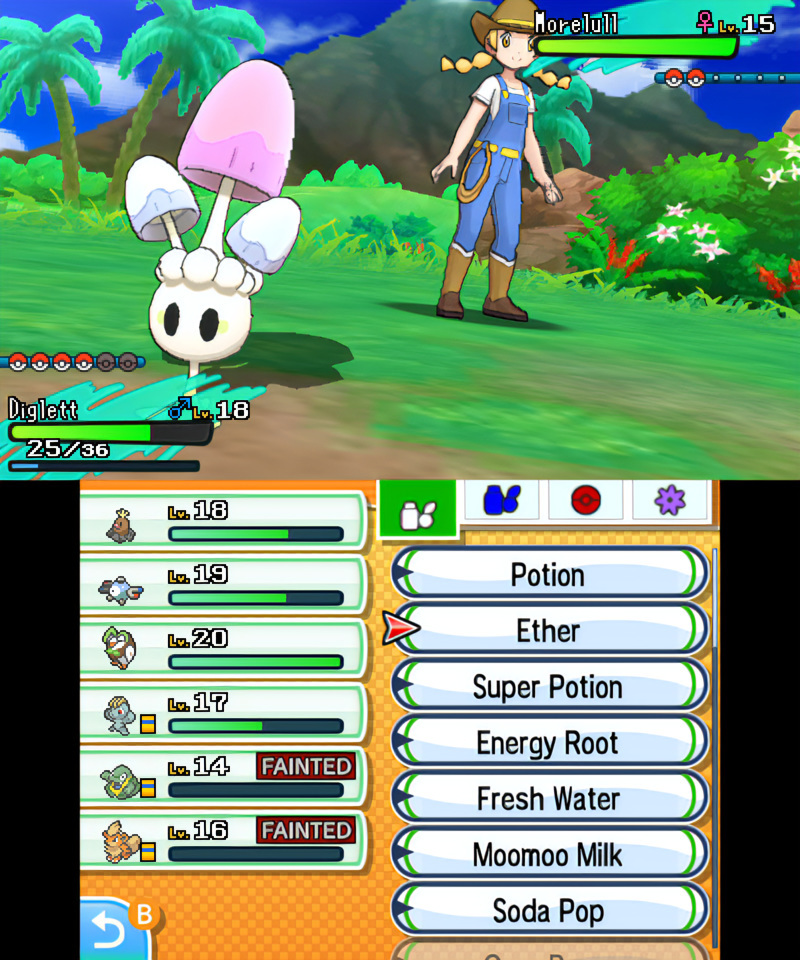 In 2016’s Pokémon Sun and Moon, the menu still includes the four easy options (“Fight”, “Pokémon”, “Bag” and “Run”), with some updates for player convenience. For one thing, looking in your bag presents items in categories, with battle items like Potion easily accessible on the first screen. And, there’s even a fifth extra button on the main menu to access the Poké Ball, so you don’t even have to look in your bag.